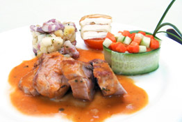 Plaats het vlees onderaan op het bord en overgiet met de saus. Leg rond het vlees de dobbelsteentjes van wortels en komkommer. Leg daar rond de spekaardappeltjes. Werk de groentjes af met de courgette